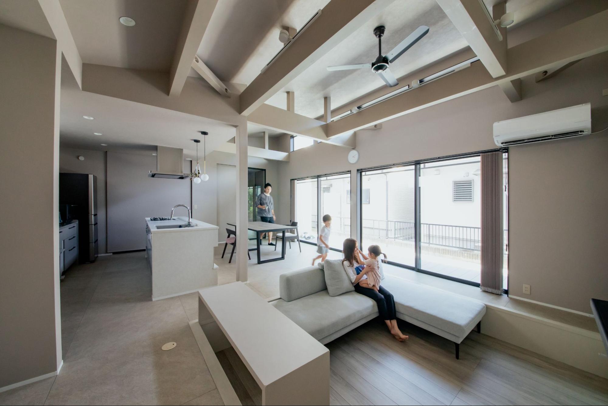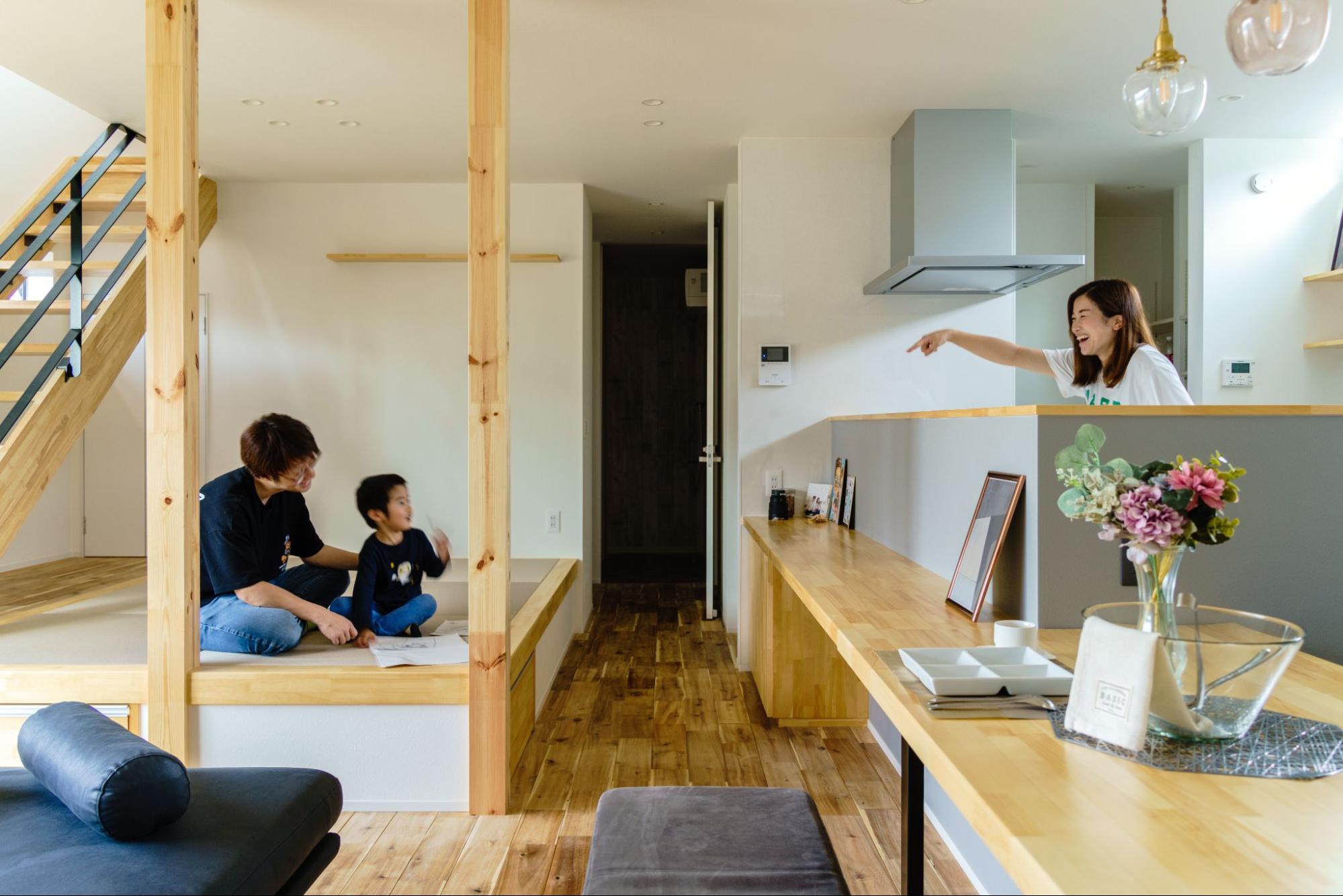 LDKの一角に設けた小上がりは、お子様たちの最高の遊び場。おもちゃを広げたり、お昼寝したり。キッチンから目が届くので、安心して家事ができます。パパやママがソファでくつろぎながら、お子様の様子を見守れるのも嬉しいポイントです。