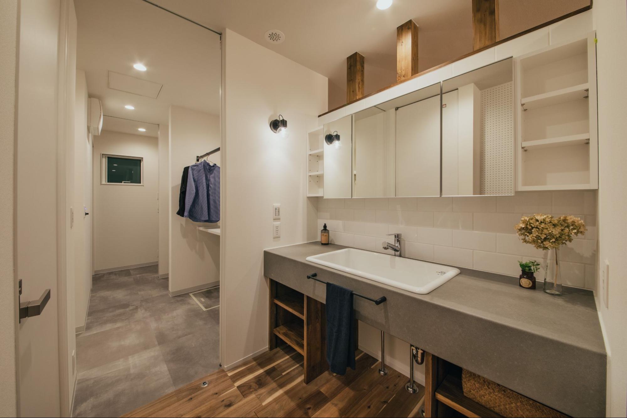 「洗面→ランドリー→脱衣室」がぐるっと回れる、考え抜かれた家事動線。帰宅後すぐに手を洗い、リビングへ。洗濯物を干して、たたんで、しまうまでが一直線。忙しい毎日の中に、ゆとりの時間を生み出します。