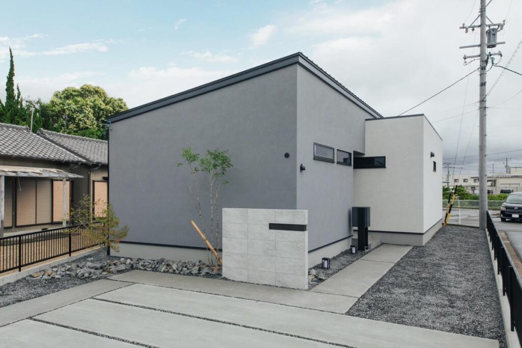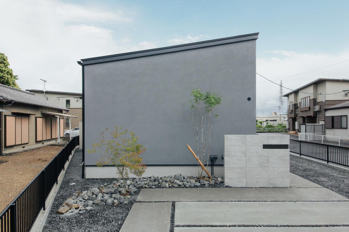 勾配のついた屋根とシンプルな箱型のボリュームを重ねることで、平屋ながらに表情と奥行き感のある外観が実現しました。