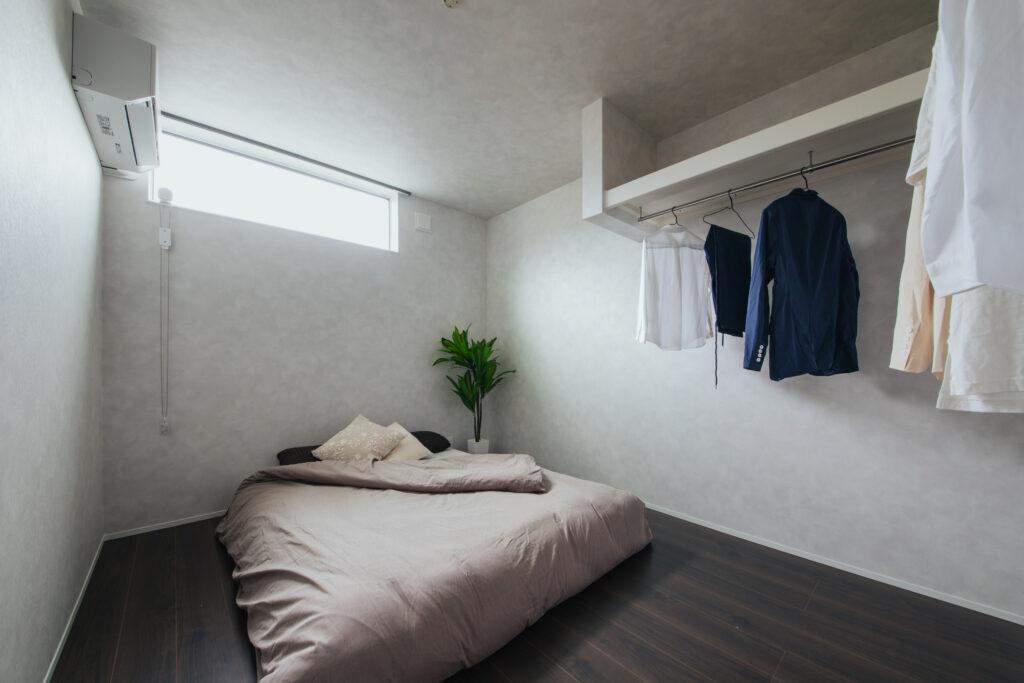 約6畳の主寝室は、洋服収納に部屋を区切ることなく、あえてオープンにすることで、室内を広くみせています。