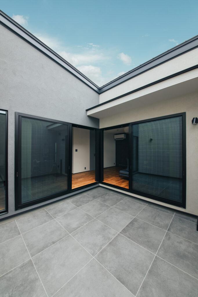 (プライベートな中庭をコの字型に囲んだ住空間は、内と外が柔らかにつながり、家族の視線と時間が自然と交差します)